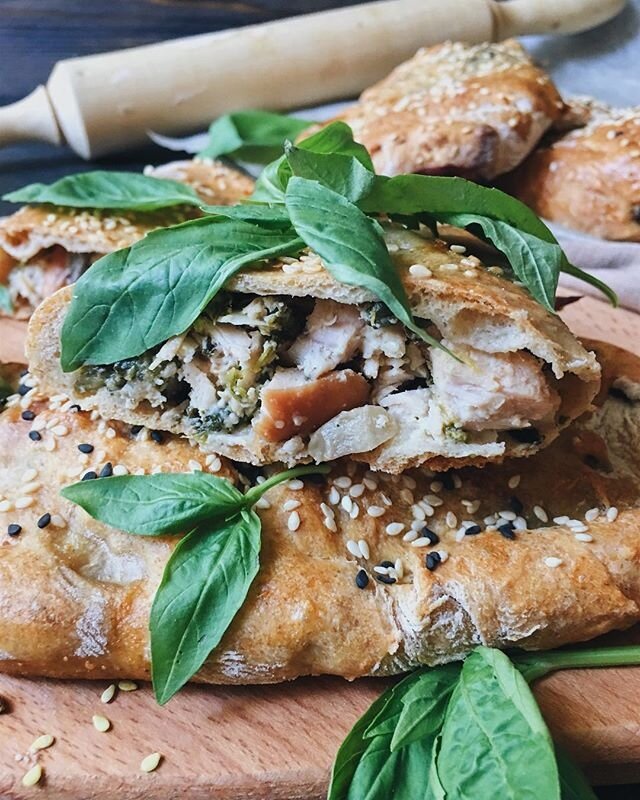 4. С помощью кисточки смажьте кальцоне желтком, посыпьте кунжутом и тертым пармезаном. Выпекайте в разогретой духовке в течение 12 минут.