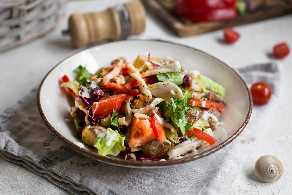 Шаг 3: Смешайте йогурт с горчицей по вкусу. Нарежьте помидоры дольками, а болгарский перец - короткими соломками. В глубокой миске соедините микс салата, томаты, перец, кальмара и картофель. Заправьте половиной соуса и тщательно перемешайте. Затем выложите готовый салат на тарелку и добавьте оставшуюся заправку сверху.
