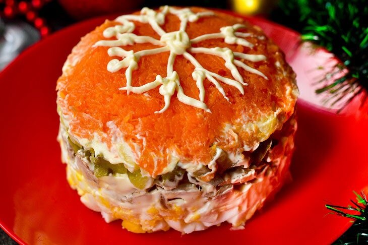 Завершите салат натертой на мелкой терке морковью, которая станет завершающим штрихом. Для оформления используйте тюбик с майонезом, чтобы нарисовать снежинку.