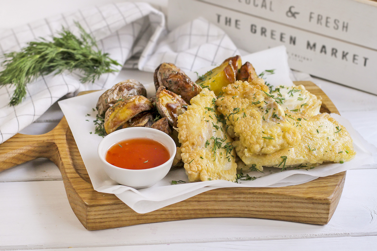 Шаг 2: Разогрейте сковороду с растительным маслом. Обваляйте кусочки рыбы в кляре. Если кляр оказался слишком густым, разбавьте его 1-2 столовыми ложками воды. Обжаривайте треску на среднем огне по 5 минут с каждой стороны до золотистой корочки. Подавайте с запеченными картофельными дольками и сладким соусом чили, чтобы насладиться уникальным сочетанием вкусов.