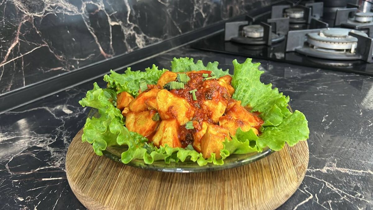 В отдельной емкости смешиваем три столовые ложки томатной пасты и 250 мл воды. При необходимости добавляем немного соли. Этот маринад заливаем в сковороду с патиссонами и готовим на медленном огне в течение 10 минут. За несколько минут до конца приготовления, блюдо можно украсить зеленью — идеально подойдет сушеный зеленый лук.