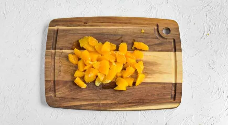 Для начала, апельсины нужно тщательно промыть, используя щетку, чтобы удалить нежелательный воск. Затем их следует обсушить, начиная с разрезания на 8 частей и удаления белой мякоти с косточками. После этого дольки лучше нарезать поперек на тонкие кусочки.