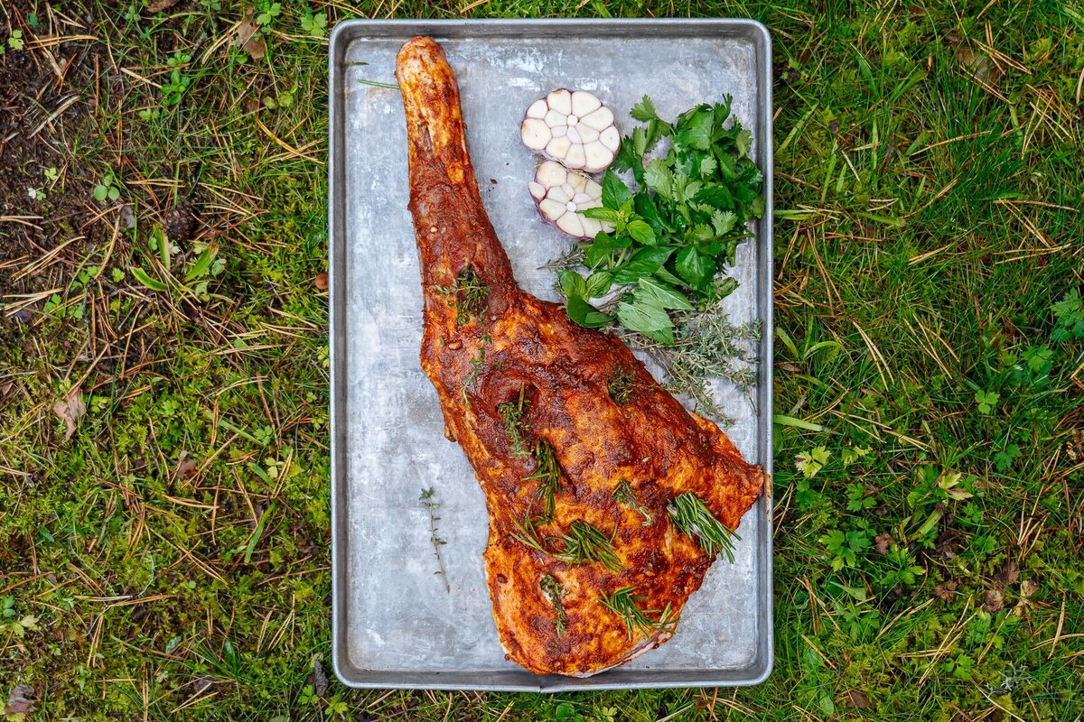 Осмотреть лопатку и удалить печать, если таковая имеется.Очистить и раздавить чеснок.Приготовить маринад, смешав давленый чеснок, луковый и чесночный порошки, копченую паприку вместе с 4 столовыми ложками оливкового масла.Разложить мясо на большом листе фольги и щедро смазать приготовленным маринадом.Сделать небольшие надрезы в лопатке и нашпиговать свежими веточками розмарина и тимьяна, чтобы добавить ароматические нотки.Завернуть мясо в двойной слой фольги и разместить на умеренном огне гриля на протяжении часа.Подавайте блюдо целиком, посыпав сверху порубленным базиликом и кинзой для яркости.
