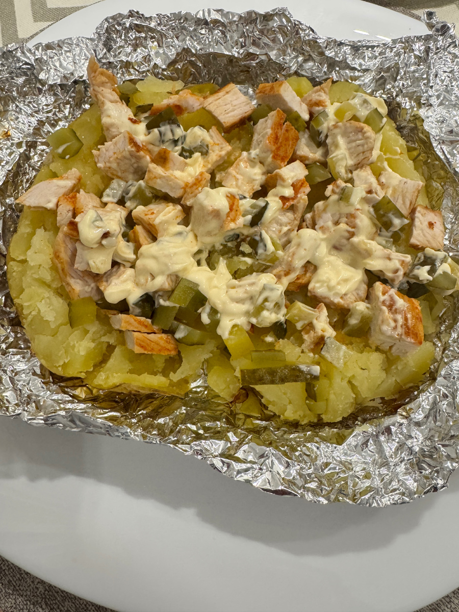 3. Завершение: Готовую картошку развернуть, размять мякоть, добавить небольшой кусочек сливочного масла и начинку. В итоге получается невероятно вкусное и сытное блюдо.