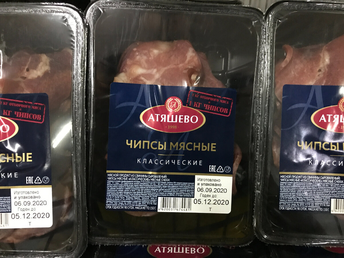 Внимание любителей мясных закусок! Мы продолжаем исследовать ассортимент сети магазинов "Светофор", и на этот раз фокус нашего внимания сосредоточился на мясных чипсах «Классические» под маркой «Атяшево». Упаковка весом 150 грамм предлагается по цене 126 рублей, а производит их компания ООО «МПК «Атяшевский».