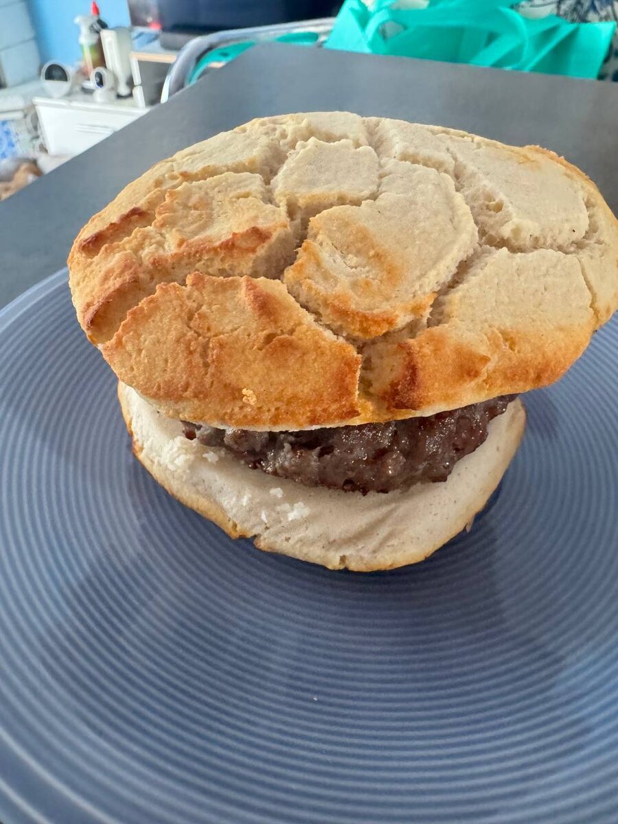 Далее, подготовьте аэрогриль, выстелив его пергаментом для выпечки. С помощью ложки выложите тесто, формируя две булочки, которые будут чуть толще стандартного бургерного основание. Выпекайте при температуре 160 градусов на протяжении 20 минут.