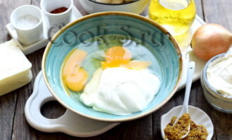 1. Подготовьте все ингредиенты согласно списку. Если используются магазинные пельмени, лучше выбрать маленькие. В отдельной миске соедините сметану с яйцом, добавьте соль и перец по вкусу. Затем введите зерновую горчицу и тщательно перемешайте до получения однородной массы.
