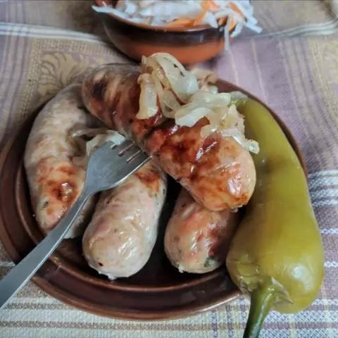 На финальном этапе колбаски помещаются в смазанную растительным маслом форму, добавляется полстакана воды, и они отправляются в духовку, где запекаются при температуре 180°C в течение 40-45 минут. Готовые колбаски можно подавать с жареным луком, шкварками, овощами и свежей зеленью.