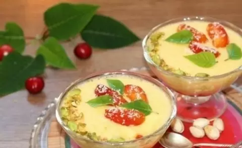 Дольки слив раскладываются по креманкам. В небольшой кастрюле апельсиновый сок доводится до кипения на медленном огне. Как только сок закипит, манная крупа поступает в раствор тонкой струйкой. Крупа варится всего минуту при постоянном помешивании, затем кастрюлю нужно снять с плиты.