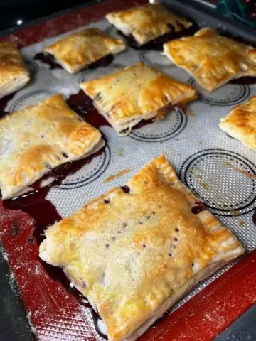 После выпекания получаются настоящие жемчужины кулинарного искусства: ароматные, хрустящие слойки с ягодной начинкой, от которых невозможно отказаться. Их даже привычно есть ложками прямо с противня!