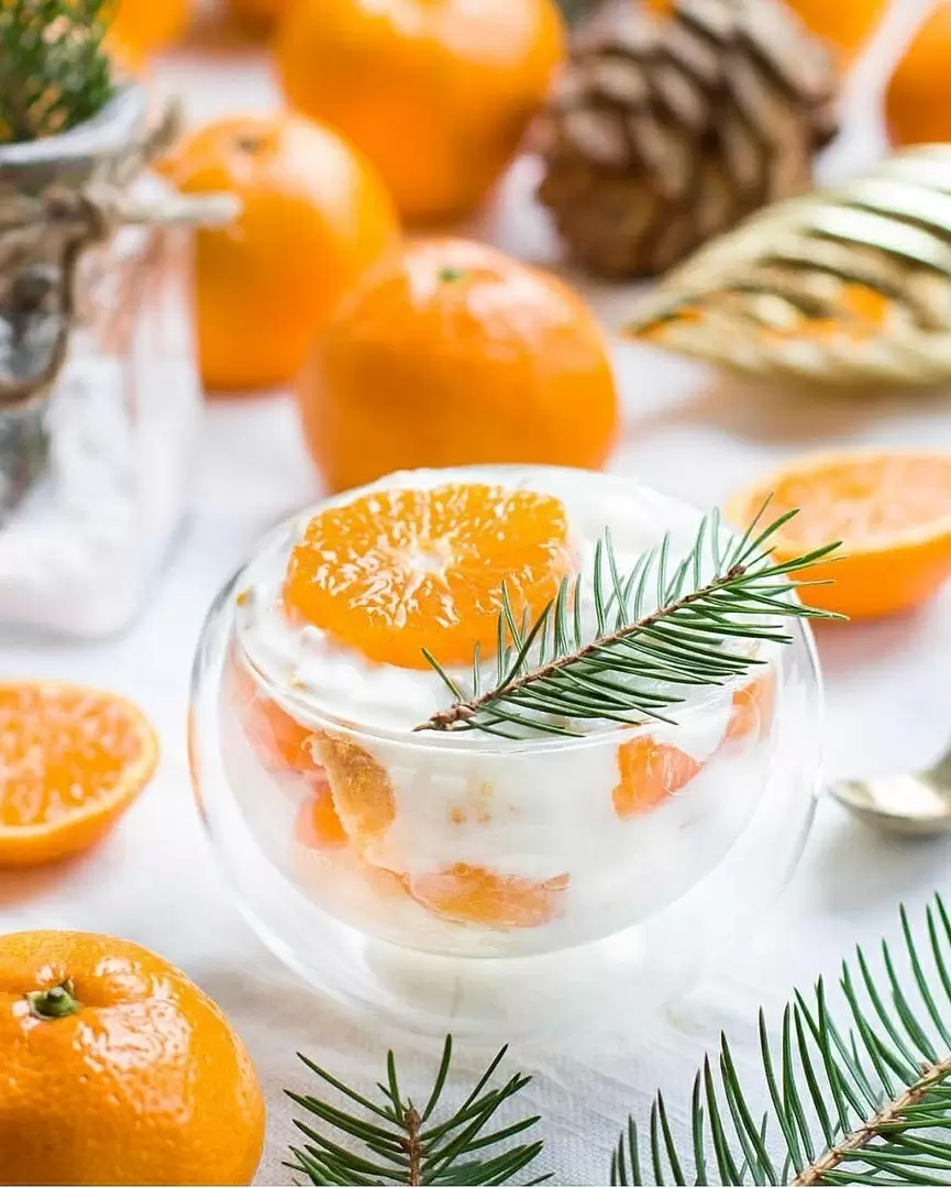 Сборка десерта: Выложите десерт слоями: сначала бисквит, затем крем, мандариновые дольки, снова крем. Для подачи украсьте по желанию свежими дольками мандарина и веточкой розмарина. Этот десерт станет великолепным дополнением к любому чаепитию!