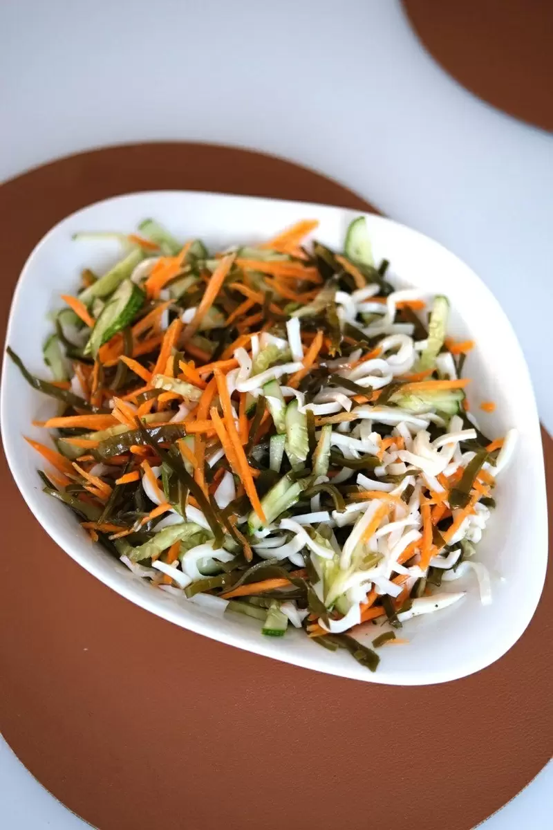 3. Сборка салата: В глубокой миске соедините все подготовленные ингредиенты: морскую капусту, тонкие кусочки кальмаров, огурцы и морковь. Заправьте салат оливковым маслом, добавьте необходимые приправы, такие как соль и перец, и немного лимонного сока для освежающего акцента. При желании, можно украсить блюдо свежей зеленью.