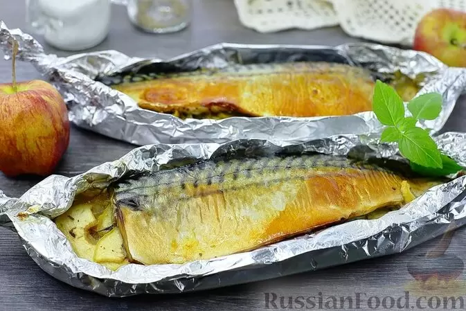 - Скумбрия с яблоками, лимоном и луком. Это блюдо всё больше завоёвывает внимание хозяек. Рыба запекается в фольге с добавлением сливочного масла, яблок и лимона. В аромате присутствуют нотки соевого соуса и розмарина, что придаёт блюду уникальную пикантность.