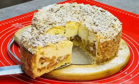 Теперь настало время собрать наш пирог. На дно формы выкладываются тушеные яблоки, затем аккуратно заливается крем-суфле, а сверху посыпается оставшейся крошкой. Пирог отправляется в разогретую духовку до 170 градусов на 45-50 минут. И вот, через несколько минут волшебства, к чаю готова настоящая кулинарная радость. Приятного аппетита!
