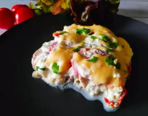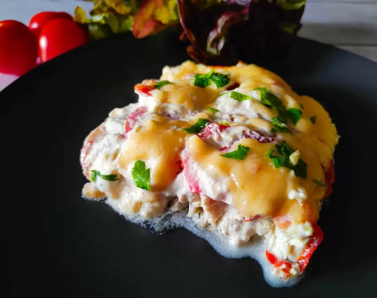 Для соуса смешиваются сметана и майонез в равных долях, добавляется давленный чеснок, и всё тщательно перемешивается. Этот соус равномерно распределяется поверх помидоров.