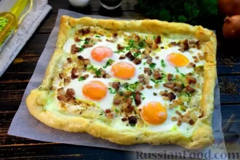 - Слоёный тарт с яичницей и беконом. Идеальный вариант для завтрака или лёгкого ужина. Использование готового слоёного теста позволяет сэкономить время, а начинки из жареного лука, яиц и бекона делают это блюдо поистине сытным и вкусным.