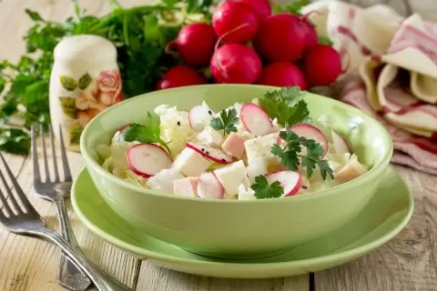 Этот салат не только притягателен внешне, но и отличается невероятно легким и свежим вкусом. Блюдо готовится быстро, а ингредиенты доступны в каждом магазине, что делает его идеальным вариантом для весеннего стола.