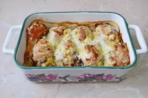 Запекание: Разогреть духовку до 180°C. Выложить окорочка в форму для запекания, налить немного воды или бульона и накрыть фольгой. Запекать в течение 40 минут, затем снять фольгу и оставить в духовке еще на 15-20 минут до появления золотистой корочки.