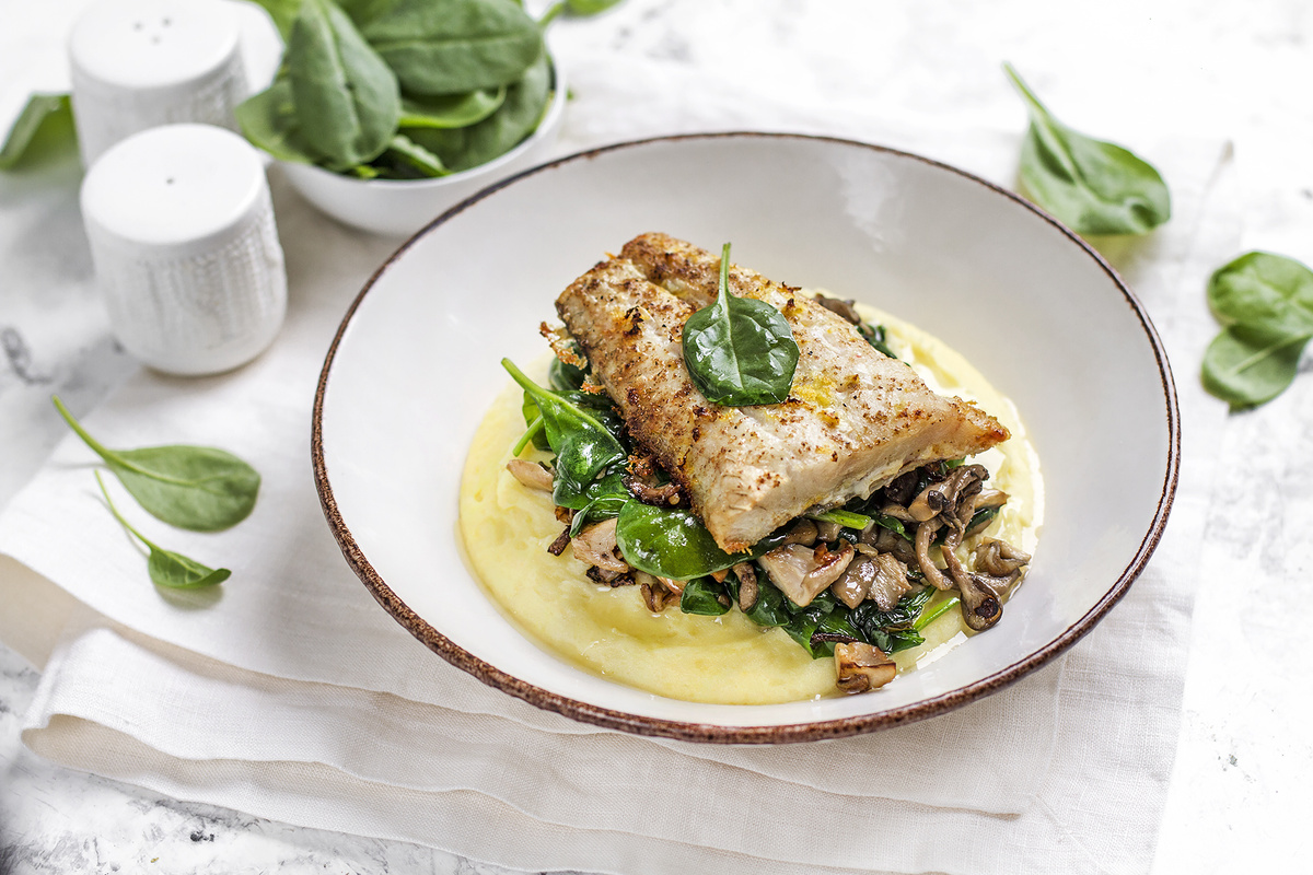Готовое блюдо подается так: на тарелку сначала кладется пюре, затем шпинат и грибы, а сверху — треска. Все это можно украсить лимонной цедрой. Это блюдо, которое можно не только запекать в духовке, но и готовить на сковороде, обжаривая треску на сильном огне до готовности.