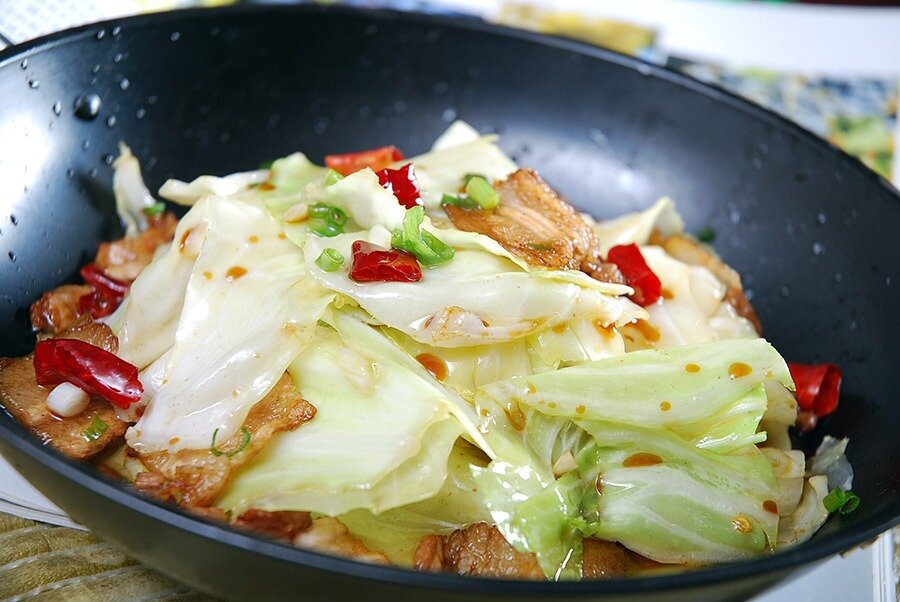 - В той же сковороде разогрейте растительное масло до легкого дымка. Добавьте имбирь, чеснок, лук и сычуаньский перец с чили. Обжарьте всё около минуты, регулярно помешивая, затем добавьте капусту. Продолжайте готовить, помешивая, 2-3 минуты. Верните бекон в сковороду, добавьте соевый соус, уксус, сахар и тщательно всё перемешайте. После 2-3 минут введите устричный соус и опять перемешайте, готовя ещё 2-3 минуты. После этого уберите с огня.
