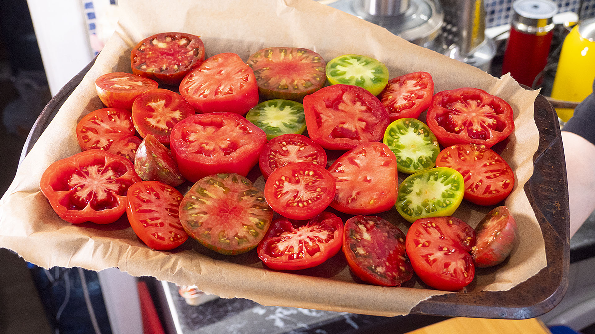 Начните с подготовки томатов: разрежьте их пополам и разложите на противне, предварительно застеленном пергаментом. Легко посолите, добавьте травы и мелко нарезанный чеснок, присыпьте сахаром и полейте растительным маслом. Выпекайте в духовке при температуре 230 градусов в течение 15 минут.