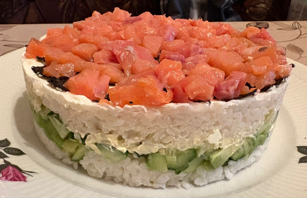 Отважные кулинары могут дать торт немного настояться перед подачей. Такой суши-торт прекрасно сочетается с соевым соусом. Приготовленный по этому рецепту, он сможет удивить гостей и стать звездой любого праздничного стола.