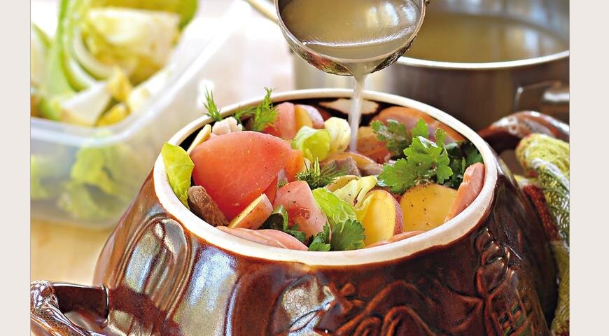 Поместите говядину в кастрюлю и залейте холодной водой – около 2 литров. Доведите до кипения, снимая пенку, и варите на минимальном огне без крышки в течение часа. Затем выньте мясо и нарежьте его на небольшие кусочки. Процедите бульон.Овощи – морковь, репу, петрушку и сельдерей – очищаем и нарезаем крупными дольками. Кочан савойской капусты также подготавливаем: убираем верхние листья, разрезаем на 5-7 частей, оставляя кочерыжку.Разогрейте топленое масло и возьмите обливной горшок. Выложите дно и стенки ветчиной, затем чередуйте слоями мясо и овощи, каждый слой приправляя маслом, солью и перцем, а также добавляя пучки зелени между слоями.Помидоры обдайте кипятком и снимите кожицу, нарежьте на 8 частей и уберите семена. Выложите помидоры на последний слой, затем нарезанный кружками картофель, полейте маслом и подсолите.Аккуратно влейте в горшок слегка остывший бульон. Закройте горшок крышкой (если она не совсем плотно закрывается, оберните соединение фольгой) и поставьте в духовку, разогретую до 160 °C, на полтора часа. Подавайте суп горячим и наслаждайтесь семейным уютом.