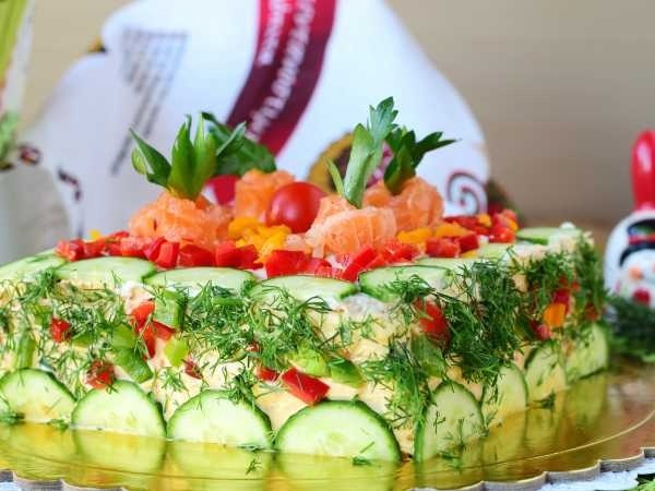 Торт смазывается майонезом и украшается овощами и семгой. После этого его стоит на пару часов поместить в холодильник для настаивания и пропитки.