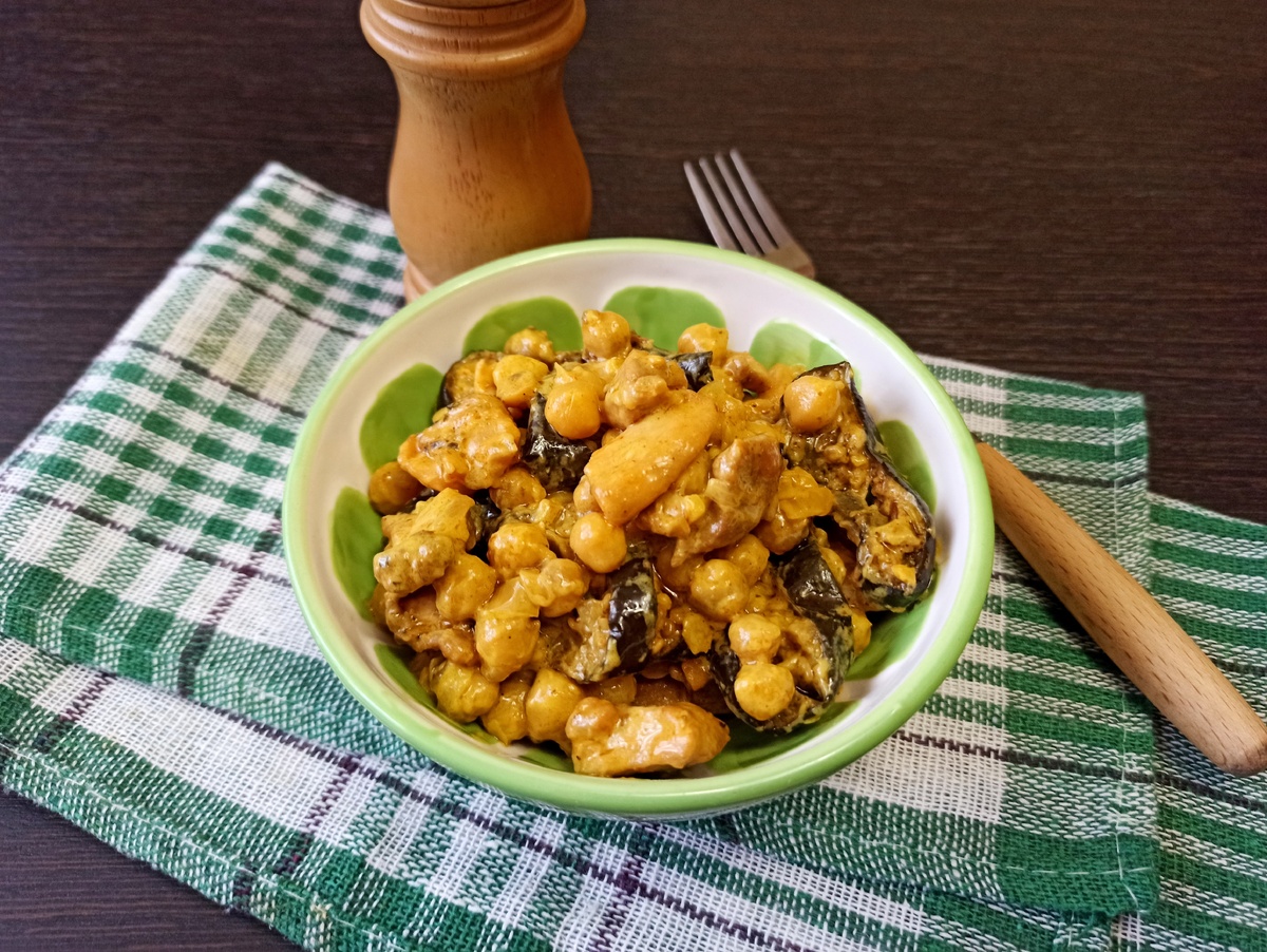4. В завершающей стадии к курице добавить запеченные баклажаны. Важно аккуратно перемешать, чтобы баклажаны впитали все ароматы соуса.