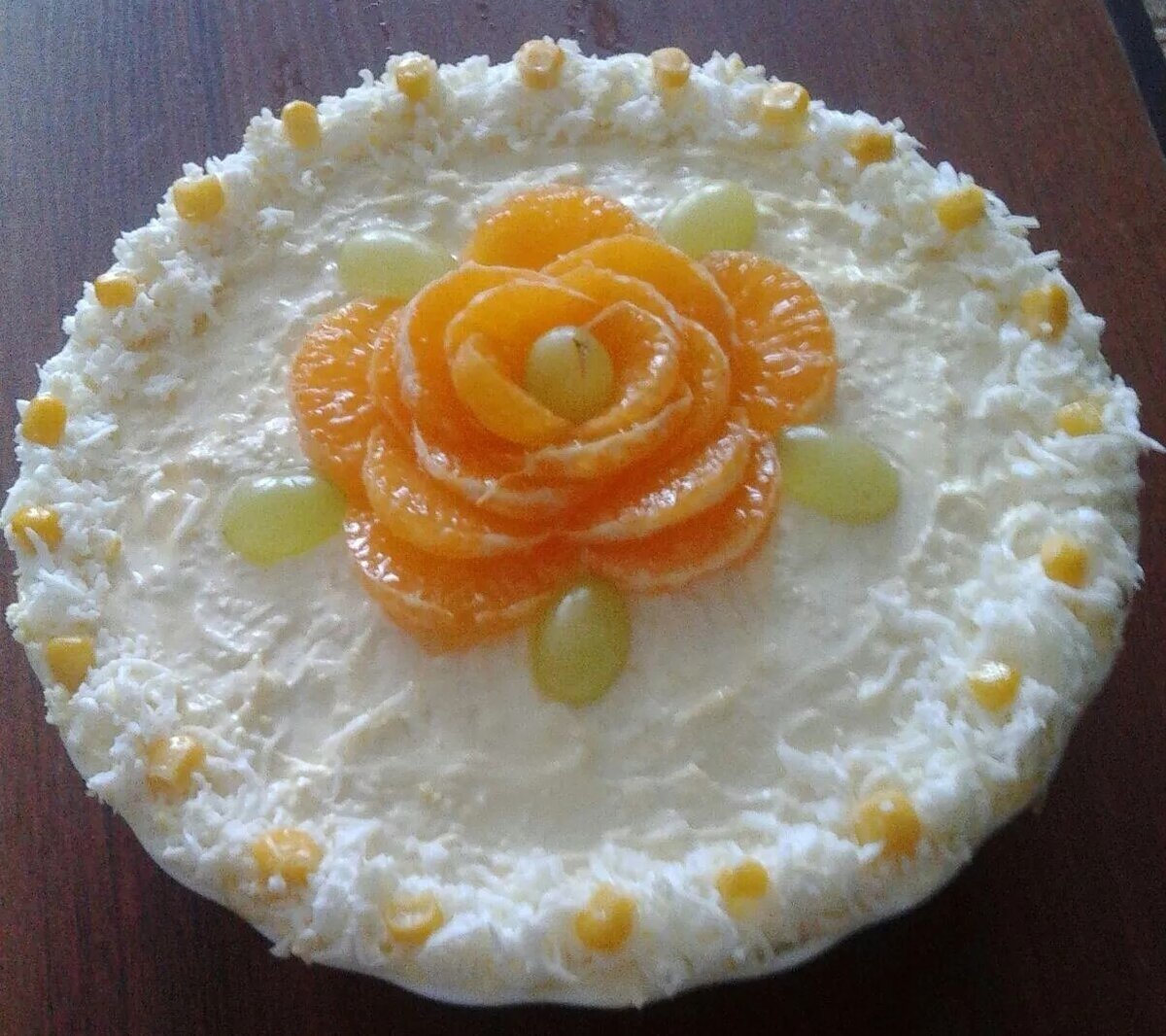 Салат стал настоящей звездой на нашем столе, его подают на каждый праздник. Один из наиболее привлекательных вариантов — это подача с красивой розочкой из апельсина, виноградинками и украшениями из кукурузы. А за оформление блюд у нас в семье отвечает дочка — рукодельница.