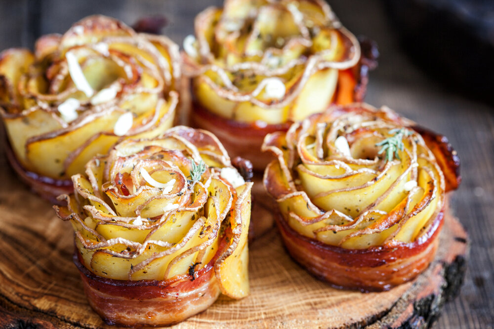 - Если у вас нет длинных слайсов бекона, их можно заменить короткими, просто удвоив количество для каждой картофельной розы.