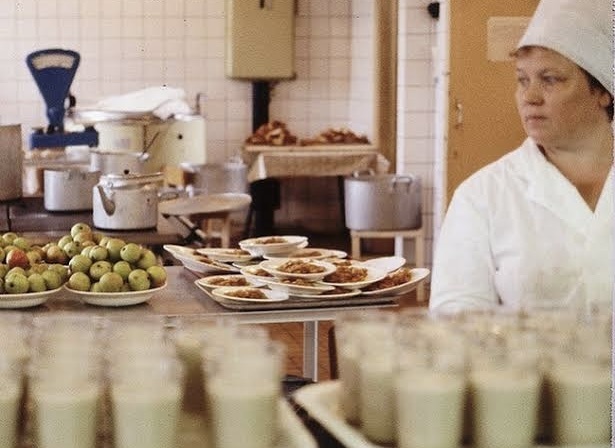 Столовая того времени представляла собой светлый зал с высокими потолками, в котором размещались ряды столов, аккуратно накрытых клеёнками. Стеклянные пирамидки с компотами и киселями, металлические подстаканники для чая — всё это создавалось для удобства и экономии ресурсов. Столовые обеспечивали простую, но сытную еду: