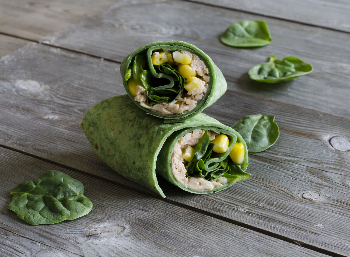 - Разделите начинку на 4 одинаковые части, равномерно распределите по лавашу, а затем скатайте в рулеты.