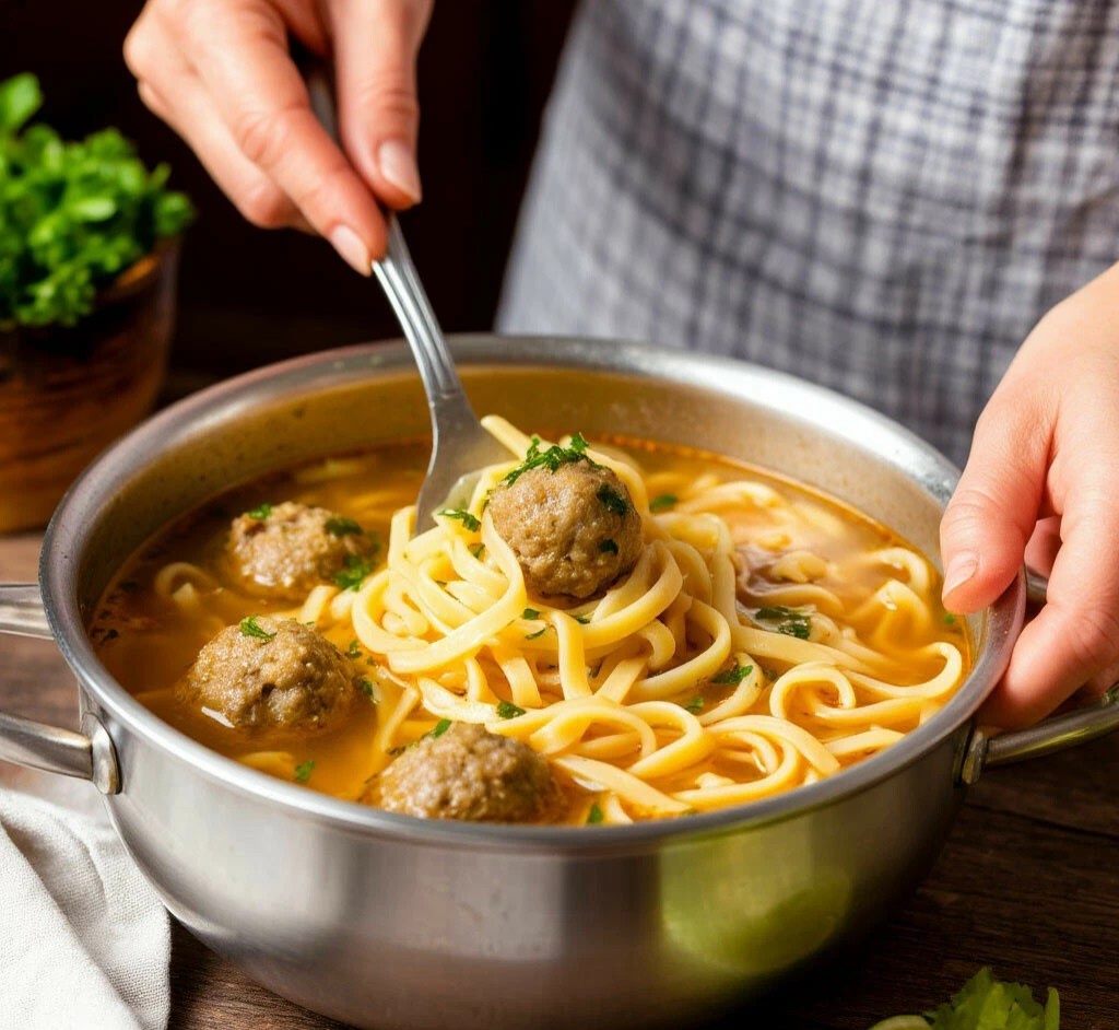 5. Завершаем суп: В кипящий бульон аккуратно добавьте фрикадельки и варите 7-10 минут. Затем опустите нарезанную лапшу, помешивая, чтобы она не слиплась, и готовьте еще 5-7 минут. Попробуйте на соль и добавьте свежую зелень по желанию.