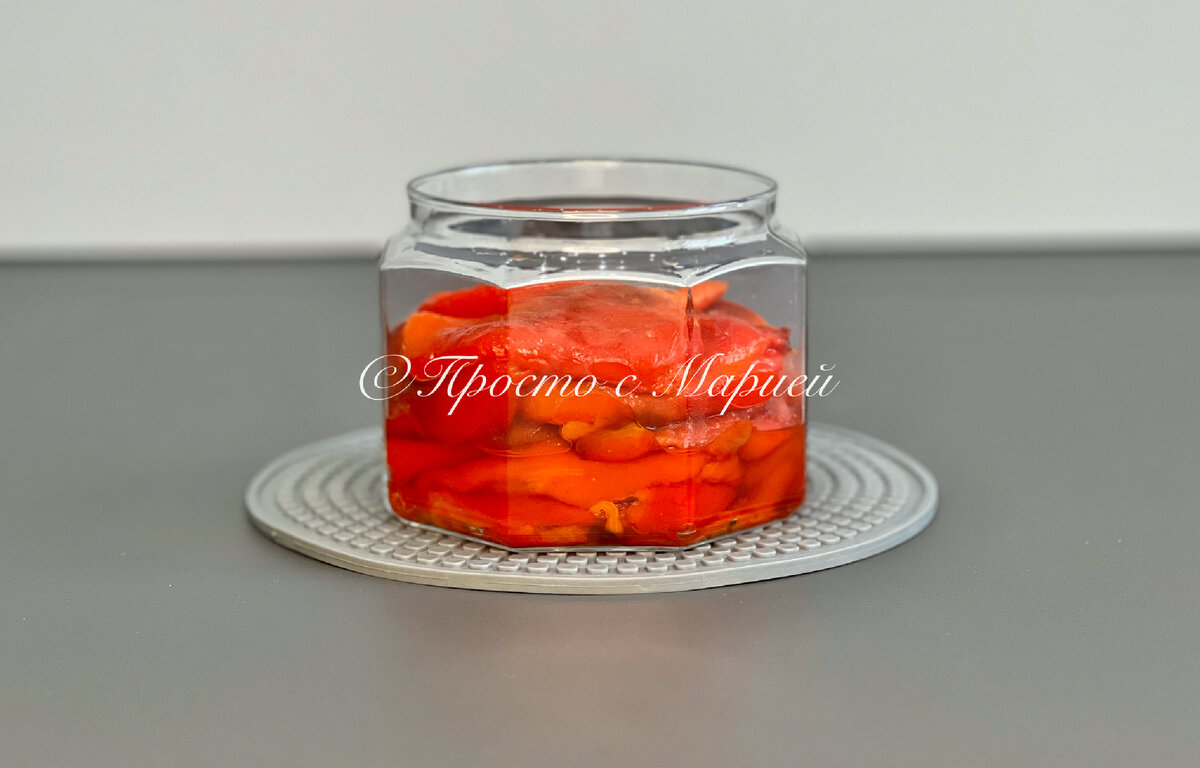 После охлаждения перцы перекладываем в чистую сухую баночку. Их можно нарезать полосками или оставить целиком.