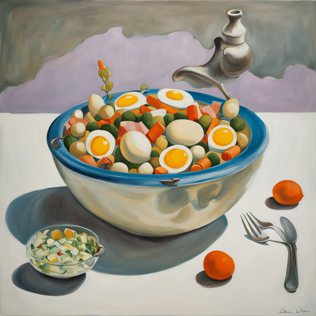 Как можно не начать с легендарного салата Оливье? Оригинальный рецепт, созданный еще в 19 веке, стал народным фаворитом в Советском Союзе. Исходные изысканные компоненты уступили место более простым, но не менее вкусным ингредиентам.