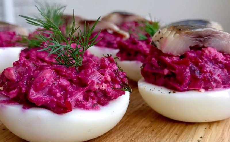 Слаженно соедините желтки, свеклу, майонез и растительное масло. Добавьте мелко нарезанную сельдь, посолите и добавьте маринованный лук. Теперь можно фаршировать половинки яиц этой ароматной смесью, украсить сверху кусочком сельди и зеленью. Новая закуска готова к подаче!