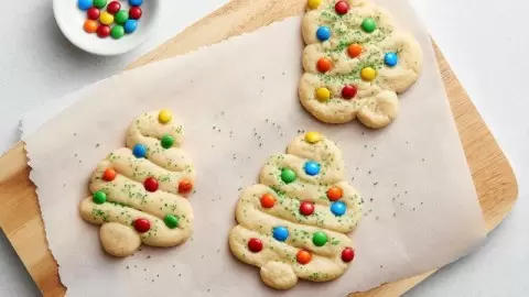 Формируйте елочки, укладывая жгутики поперек верху к низу. Внизу прикрепите небольшой кусочек теста — это будет ствол. Теперь украсьте ёлочки цветными конфетами и не забудьте добавить радужную конфетку на вершину каждой. Затем посыпьте все сахаром, накройте пленкой и уберите в холодильник на час, чтобы тесто не увеличивалось в размерах при выпекании.