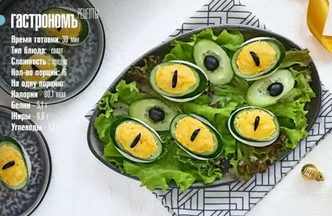 Шаг 3: Используя маслины, вырежьте «зрачки» и аккуратно вдавите их в центр каждой половинки яйца. Для подачи разложите листья салата на блюде, разместив на них фаршированные яйца, и обложите остатками нарезанных огурцов, добавляя немного майонеза и кусочки маслин вокруг.