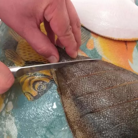 Для начала рыбу следует разморозить, очистить от чешуи и промыть под водой. Затем, вдоль каждой туши делаются неглубокие надрезы.