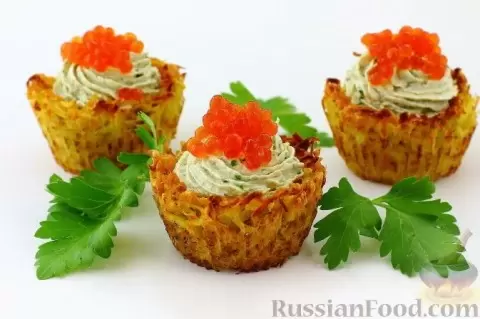 Не менее интересная закуска — картофельные корзинки с селёдочным кремом. Тёртый картофель, смешанный с сыром, формируется в корзинки и заполняется начинкой из творога с селёдкой и яблоком. Для праздничного оформления можно использовать красную икру.