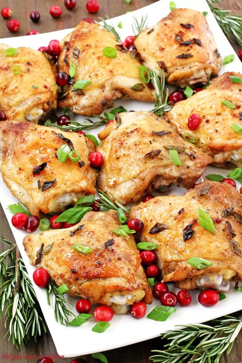 Перед выпечкой бедра следует еще раз перемешать, чтобы специи равномерно распределились. Поместите их на противень, застеленный пергаментом, добавьте свежую клюкву и зелень, а в уголки противня положите веточки розмарина для создания насыщенного вкуса. Запекайте блюдо в духовке в течение 45-50 минут.