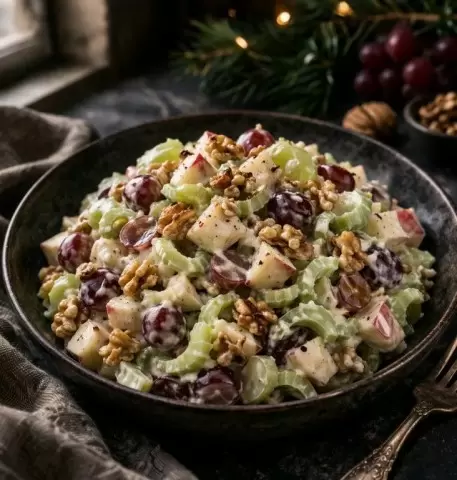 Этот салат был создан в знаменитом отеле Waldorf Astoria в Нью-Йорке в 1800-х годах. Изначально его рецепт включал лишь яблоки, сельдерей и майонез. Однако со временем к нему добавили сочные акценты: виноград, орехи и свежую зелень. Это блюдо стало символом уютного праздника, идеальным способом представить свежие фрукты и орехи в оригинальном формате.