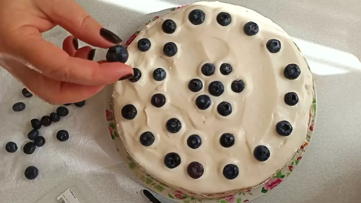 Разделите остывший бисквит на две половины и обильно смажьте каждую кремом. Верх торта также покройте оставшимся кремом и аккуратно украсьте голубикой. Дайте торту настояться в холодильнике на 2-3 часа, чтобы он пропитался и стал еще более вкусным.