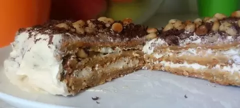 Теперь пришло время собрать пирожное! Нарежьте корж квадратами и укладывайте их стопкой, промазывая каждый слой кремом. Украшение можно сделать на ваш вкус: шоколад, орехи или свежие ягоды. Дайте десерту настояться в холодильнике, лучше всего оставить на ночь для достижения наилучшего вкуса.