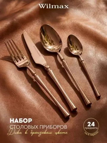 Эта элегантная коллекция в теплых бронзовых тонах представляет собой премиальные приборы из нержавеющей стали, дополненные долговечным покрытием. Они не только выглядят солидно, но и дарят ощущение роскоши на вашем столе.