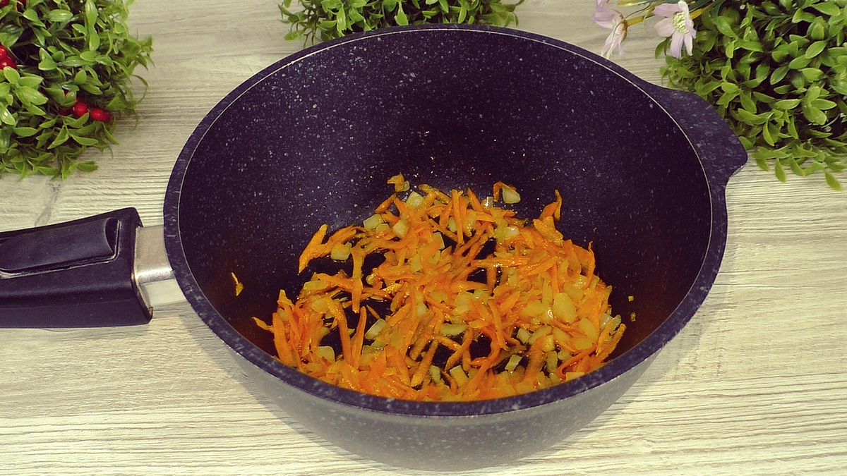 Если вы используете кастрюлю с толстым дном, овощи можно не обжаривать. В противном случае, на небольшом количестве растительного масла следует обжарить лук и морковь до мягкости. Затем добавьте горячую воду и доведите до кипения.