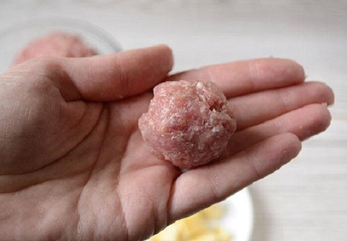 • Отщипните от фарша кусочек, сформируйте лепешку и положите в центр кусочек сыра.